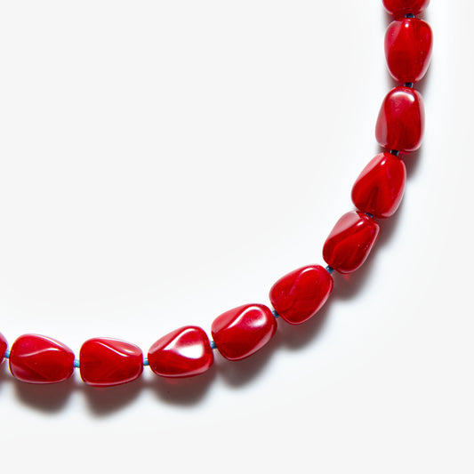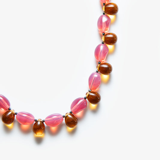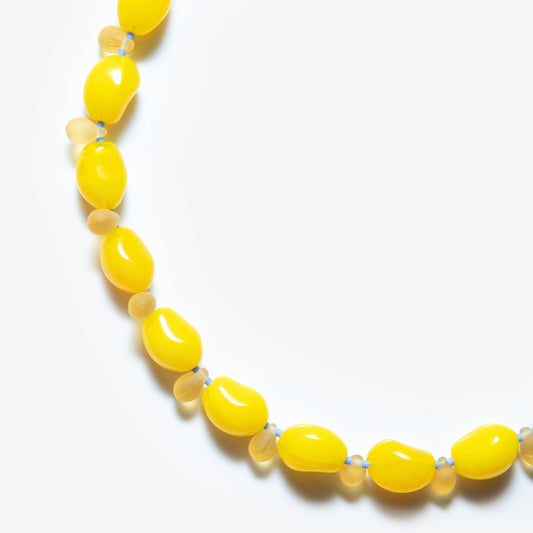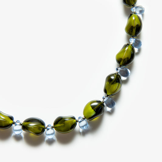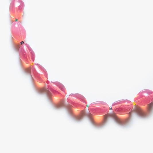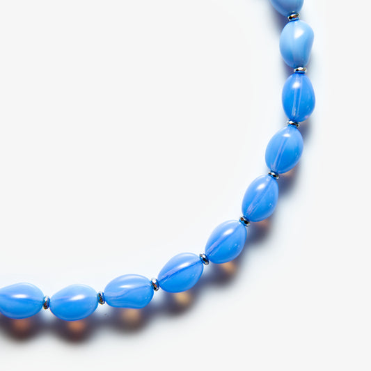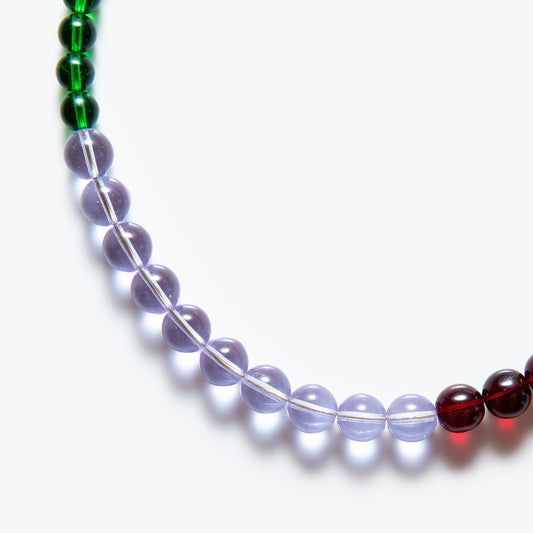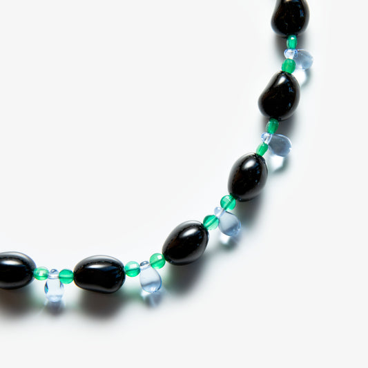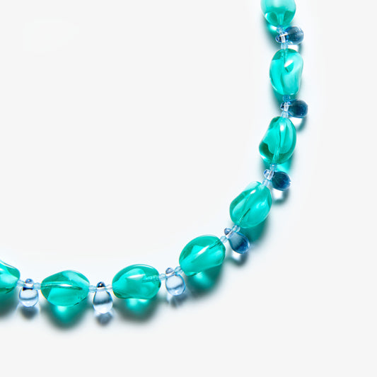 Mini Necklace features an array of small glass beads and drops, along with semi-precious stones, all artfully arranged to create a thin silhouette that is both playful and sophisticated.