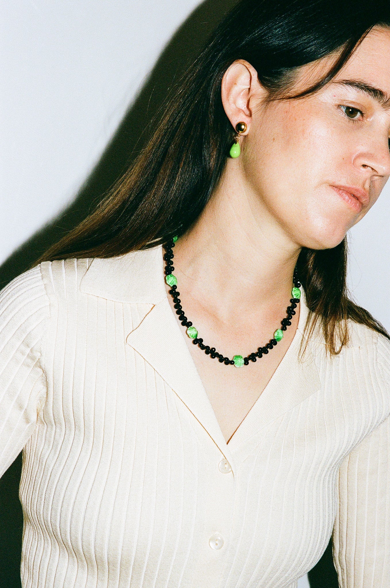Necklace with Black Glass Drops & Green Vintage Beads.