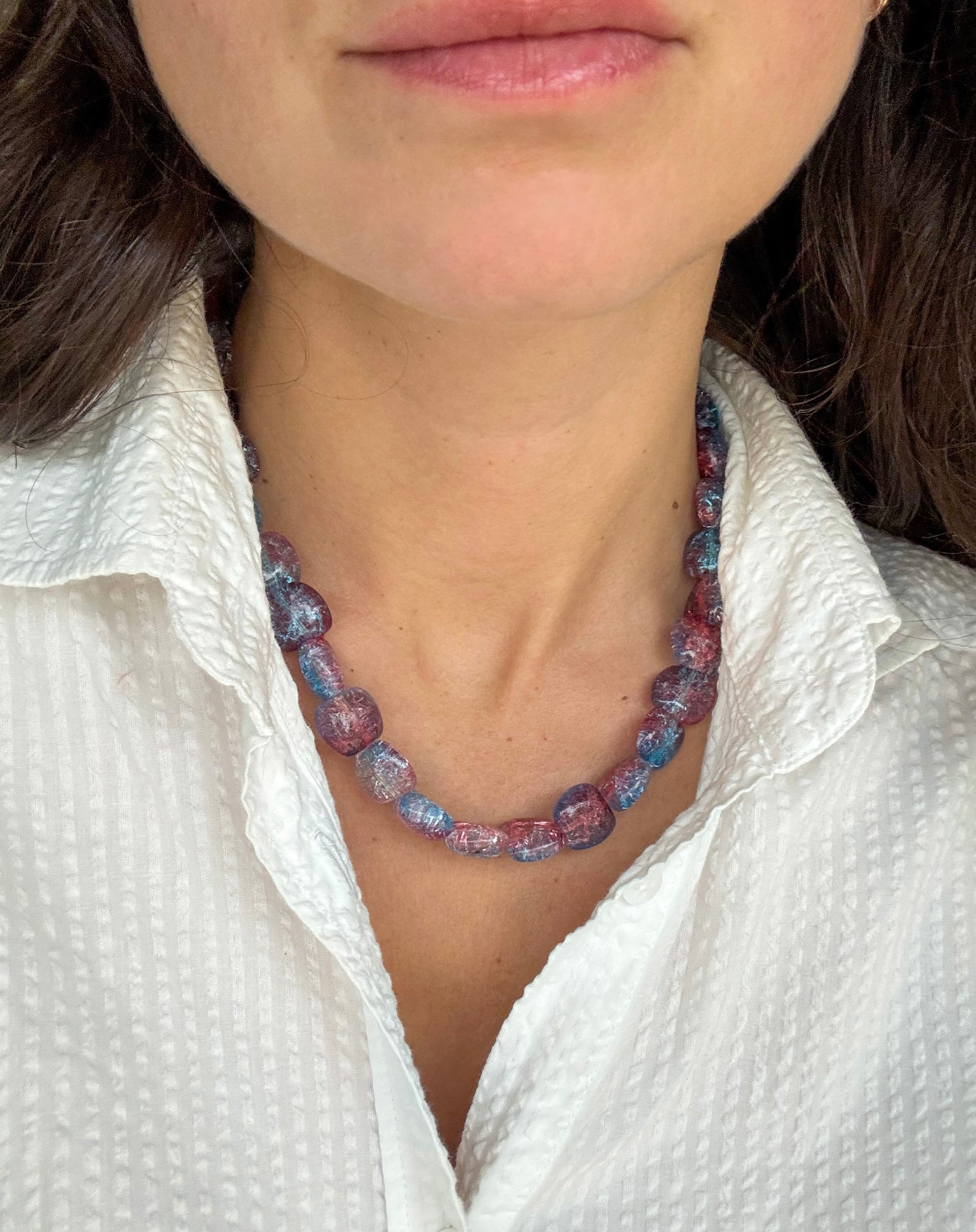 All of our jewelry is handmade in our atelier. Glass beads may have natural imperfections and are not perfectly identical, adding to the unique character of each piece.